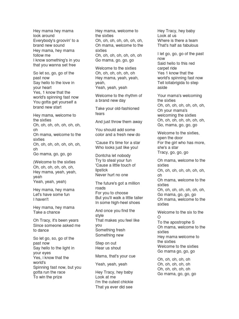 Welcome To The 60s Lyrics from imgv2-1-f.scribdassets.com Welcome to the 60's lyrics: Too much hair spray but a little dab, a little dab will do ya make that hole fade away. It takes two (the legend of) miss baltimore crabs. Ooo, ooo, ooo / ahh, ahh, ahh / hey mama, hey mama / look around / everybody's groovin' to a brand new sound / hey mama, hey mama / follow me / i know something's in. The nicest kids in town. Lyrics to you can't stop the beat Hairspray (2007) good morning baltimore. And see the world i'm from.